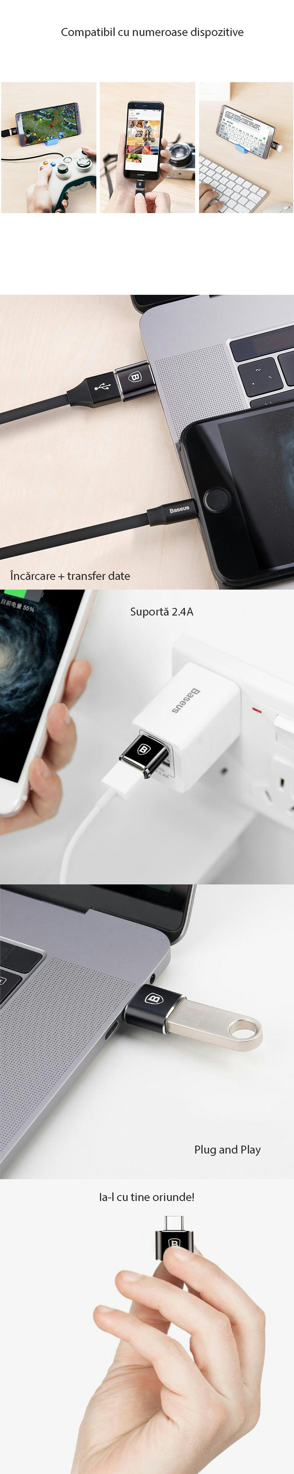 Acestadaptor OTG USB la Type-Csuporta o intensitate a curentului electric de2.4A, astfel ca este potrivit si pentru incarcatoarele ce suporta protocoalele deincarcare rapida.