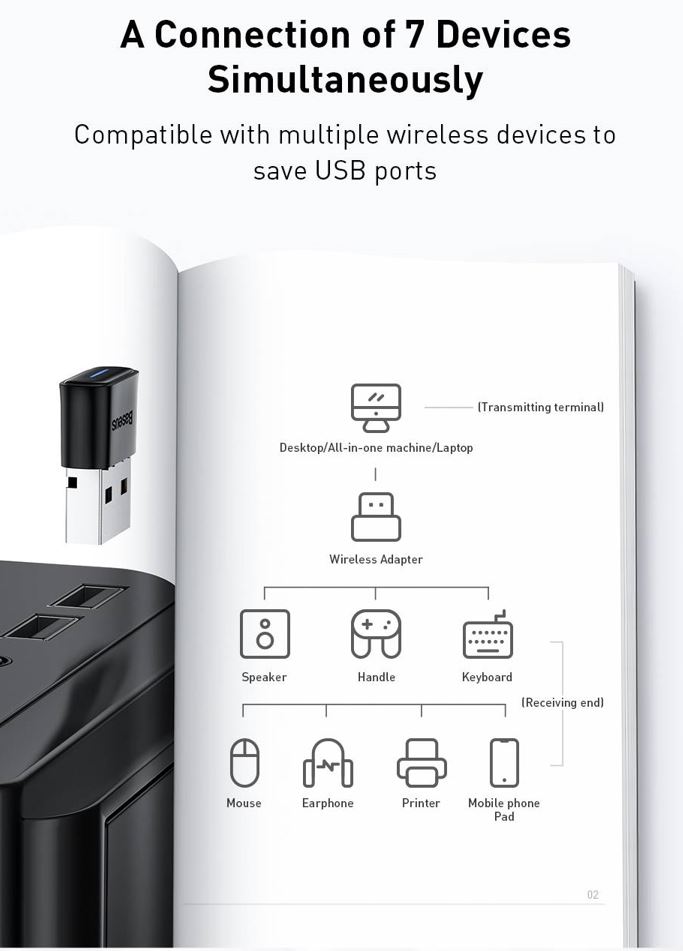 Gadgetul compact si functional de la marca Baseus iti permite sa conectezi fara fir dispozitive cum ar fi mouse-ul, castile, gamepad-urile si difuzoarele la laptop. BA04 iti ofera posibilitatea de a conecta pana la 7 dispozitive simultan.