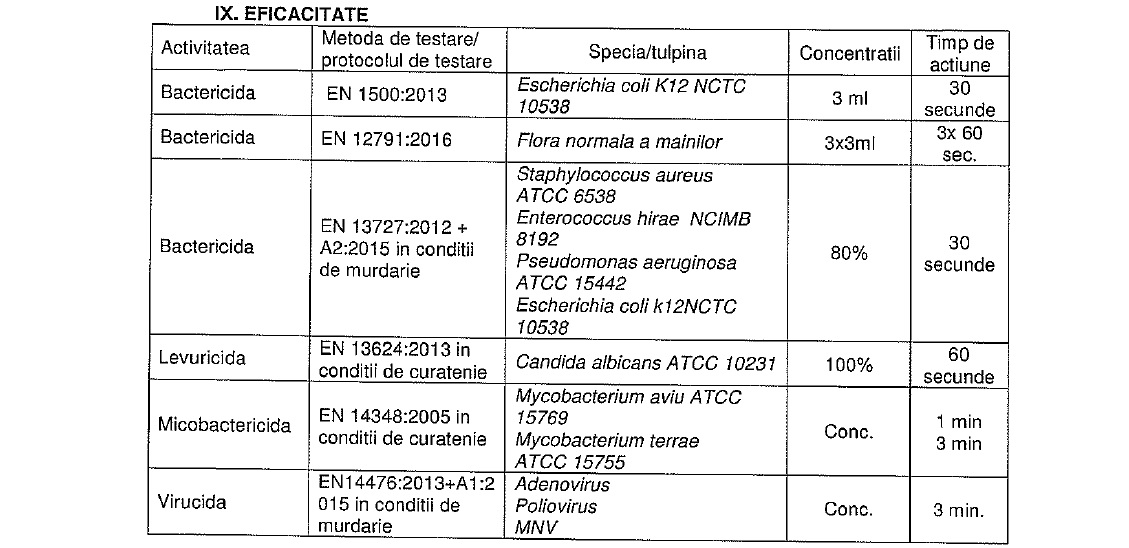 Persistent: Eficacitate biocida cu efect remanent de 3 ore de la aplicare.