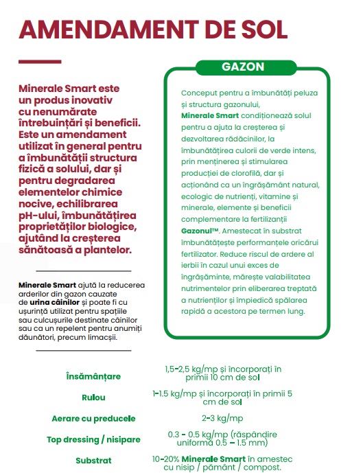Concepute pentru a imbunatati peluza si structura gazonului, Minerale Smart conditioneaza solul pentru a ajuta la cresterea si dezvoltarea radacinilor, la imbunatatirea culorii de verde intens, prin mentinerea si stimularea productiei de clorofila, dar si actionand ca un ingrasamant natural, ecologic, de nutrienti, vitamine si minerale.