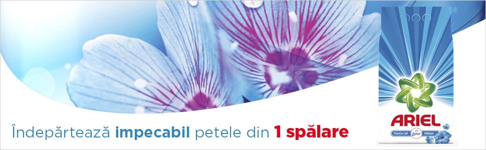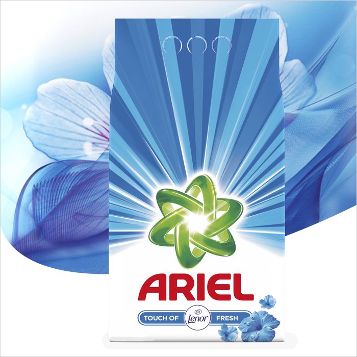 Detergentul purda Ariel indeparteaza petele din profunzimea fibrelor lasandu-ti hainele curate dupa fiecare spalare. In plus mirosul proaspat de Lenor te va binedispune pe tot parcursul zilei.