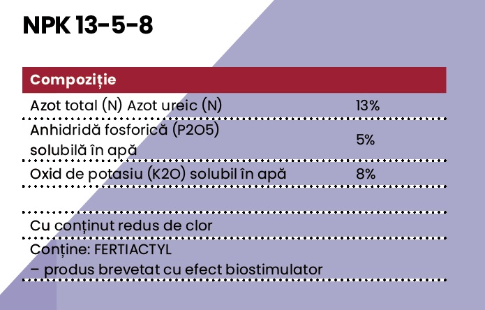 Azot total (N) – 13%, Azot ureic (N) - 13%, Anhidridă fosforică (P2O5) solubilă în apă - 5%, Oxid de potasiu (K2O) solubil în apă - 8%, cu conținut redus de clor.
