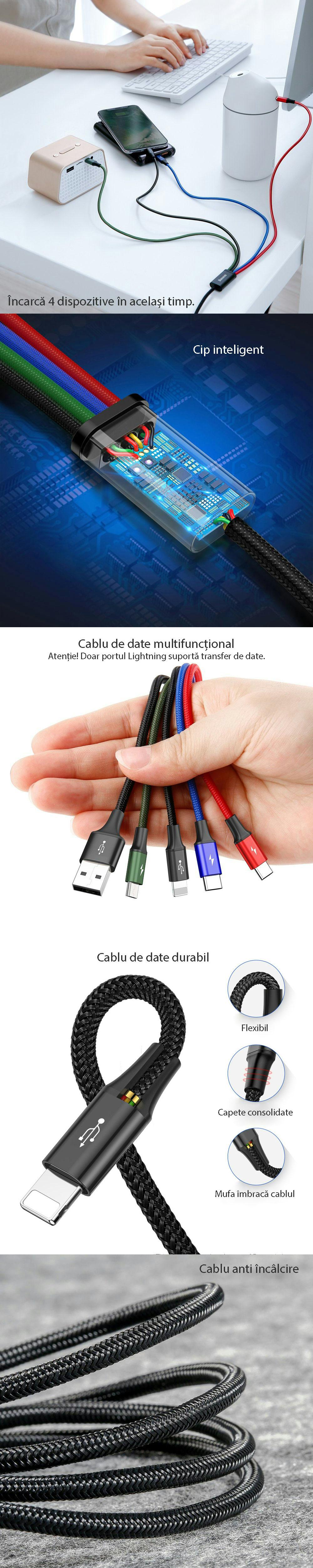 Cablul de inalta calitate va permite sa incarcati rapid si fara efort simultan patru dispozitive - doua cu conectori USB-C si unul cu conector Lightning si micro USB. Fiecare cablu are o culoare diferita, ceea ce le face usor de distins. Cablul accepta incarcare de pana la 3,5 A (max. 2 A per cablu) si este universal datorita compatibilitatii sale largi.