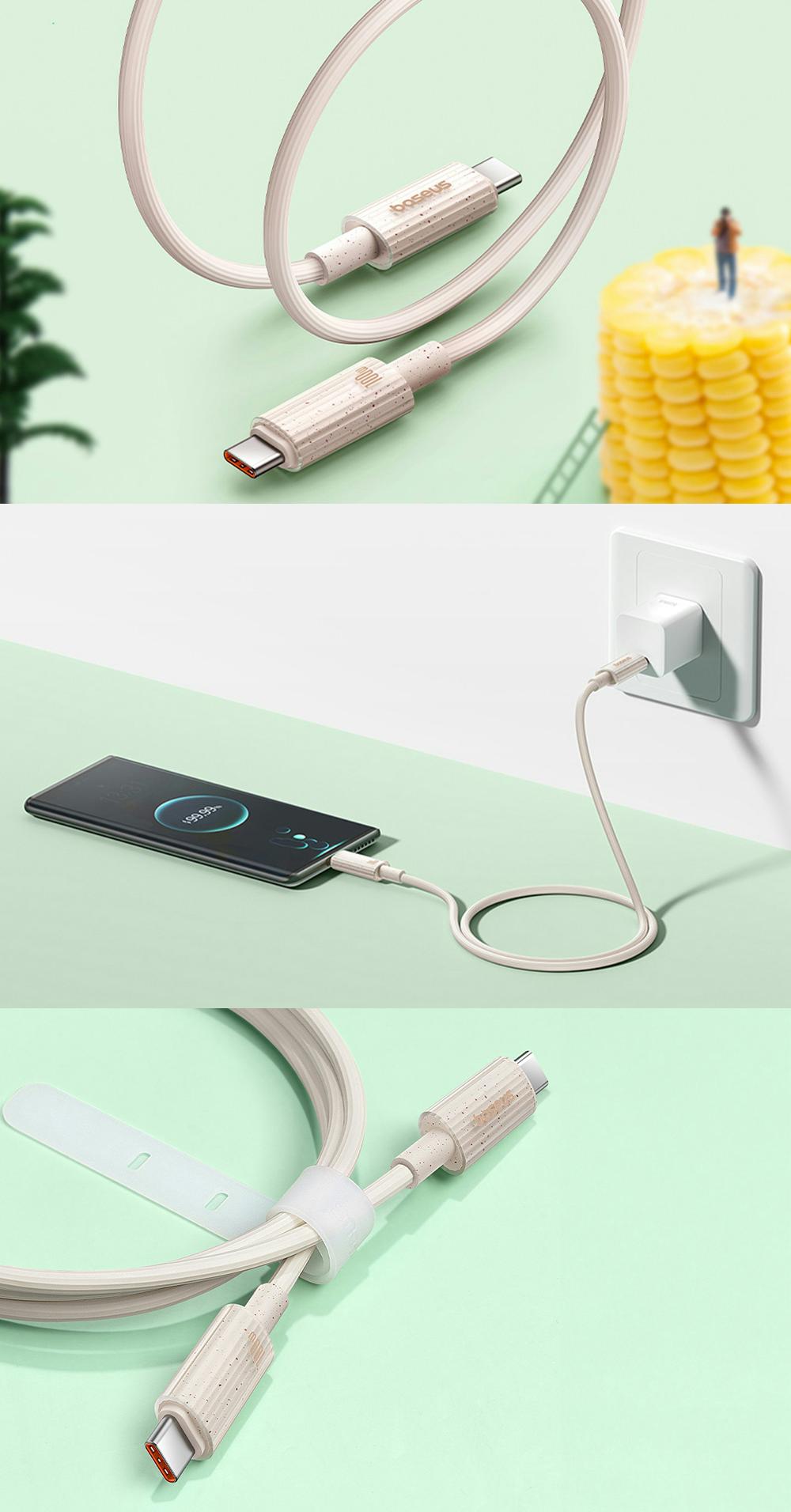 Cablul a fost creat din plastic PC si finisat cu 42% materiale biodegradabile - plasticul a fost inlocuit cu amidon de porumb. De asemenea, a trecut o serie de teste de durabilitate, ceea ce il face rezistent la indoire. In plus, datorita lungimii sale de 2 m, va facilita incarcarea echipamentelor in locuri unde priza de curent este departe. De asemenea, il puteti utiliza in mod convenabil in timp ce il incarcati. In plus, o curea speciala faciliteaza depozitarea produsului si il protejeaza impotriva incurcarii.