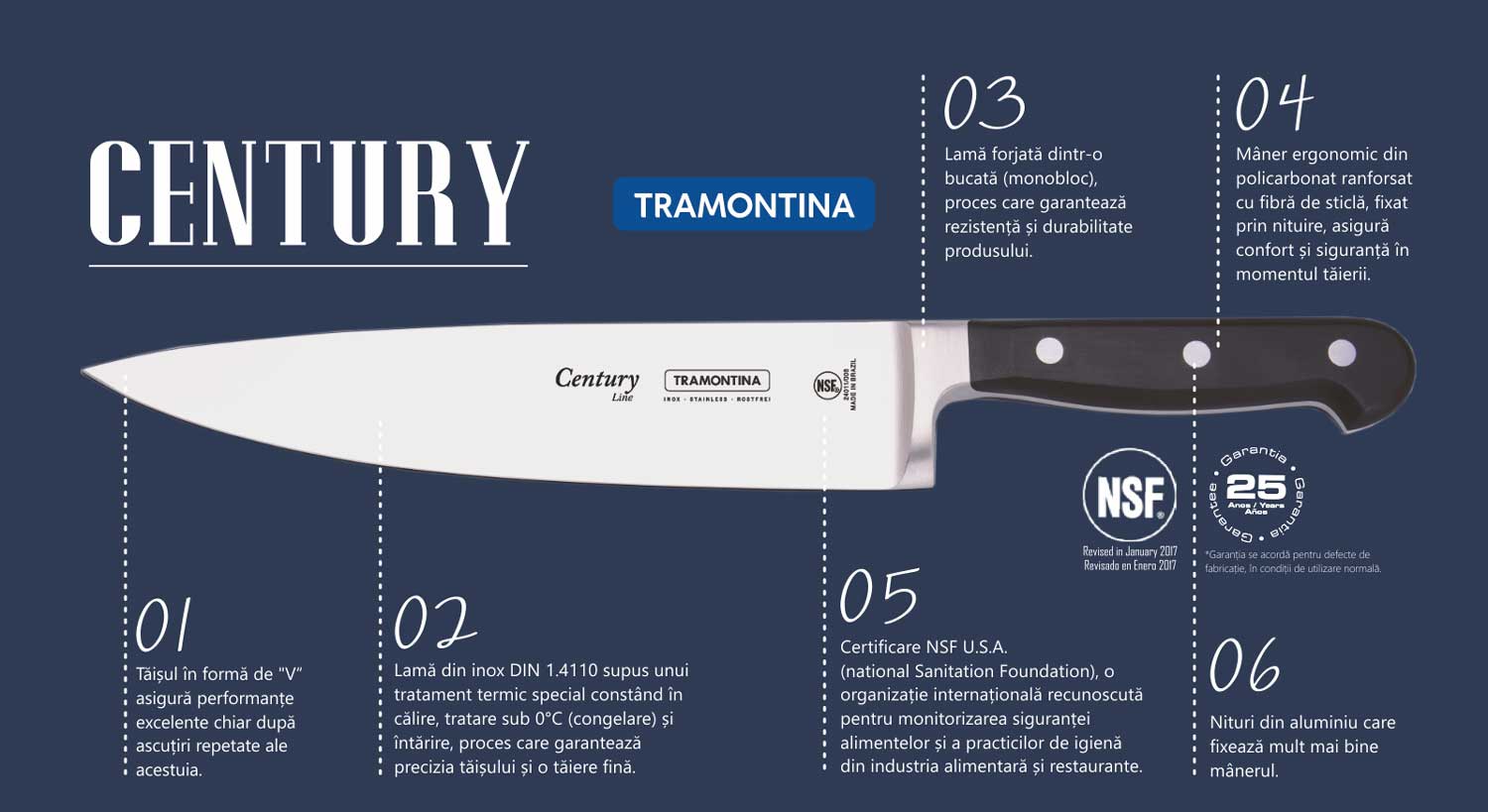 Cutit bucatar gama CENTURY, lama forjata din inox de foarte buna calitate (DIN 1.4110) supus unui tratament termic special constand in calire, tratare sub 0ºC (congelare) si intarire, in vederea obtinerii unei duritati de peste 56 HRC, lungime lama 152 mm; maner ergonomic din policarbonat ranforsat cu fibra de sticla, fixat prin nituire, asigura confort si siguranta in momentul taierii; produs cu certificare NSF U.S.A.; se poate curata in masina de spalat vase; lungime totala 275 mm.