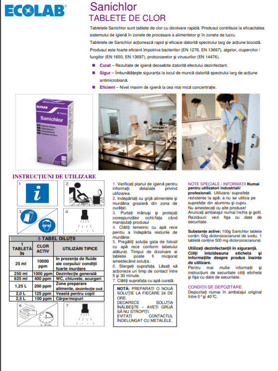 Tabletele Sanichlor sunt tablete de clor cu dizolvare rapidă. Produsul contribuie la eficacitatea sistemului de igienă în zonele de procesare a alimentelor şi în zonele de lucru.