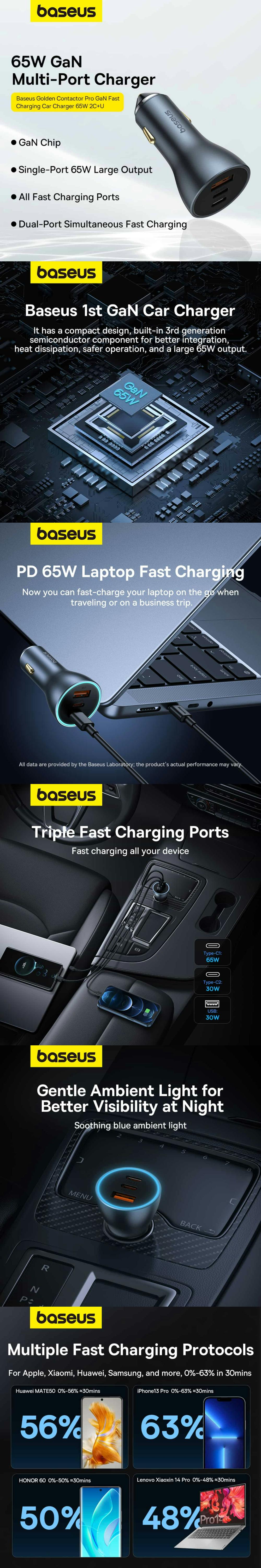 Acesta foloseste tehnologia avansata GaN (nitrura de galiu), ajutand la crearea unui incarcator mai compact si mai puternic decat tehnologiile traditionale. Acest lucru permite incarcatorului Baseus Golden Contactor Pro sa aiba dimensiuni compacte, economisind spatiu in masina.