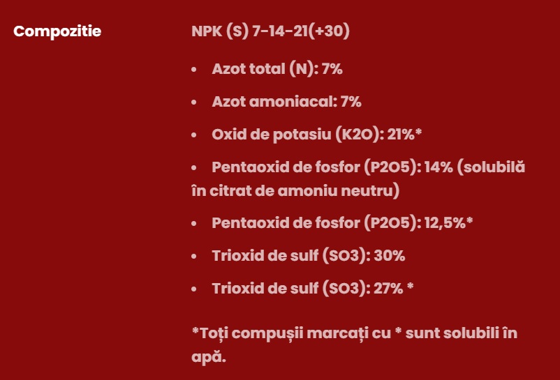 Poate fi folosit cu succes pentru prevenirea și tratarea bolilor de nutriție. Prin folosirea și dozarea adecvată, fertilizantul intensifică coloritul general al frunzelor, împiedicând îngălbenirea și uscarea plantelor în condiții de stres.