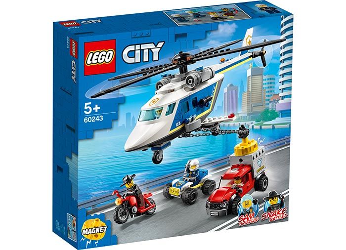 Copiii pasionati de jocul de roluri vor fi incantati de acest set de joacaLEGO City Urmarire cu elicopterul politiei (60243)care include un elicopter de politie cu un magnet functional pe un lant. Tinerii aparatori ai legii se pot alatura erouluiTVA LEGO City Sam Grizzledin lupta sa pentru a proteja orasul impotriva criminaluluiSnake Rattler. Adaugand o furgoneta, o motocicleta si unATVal politiei, totul este gata pentru aventuri dinamice!