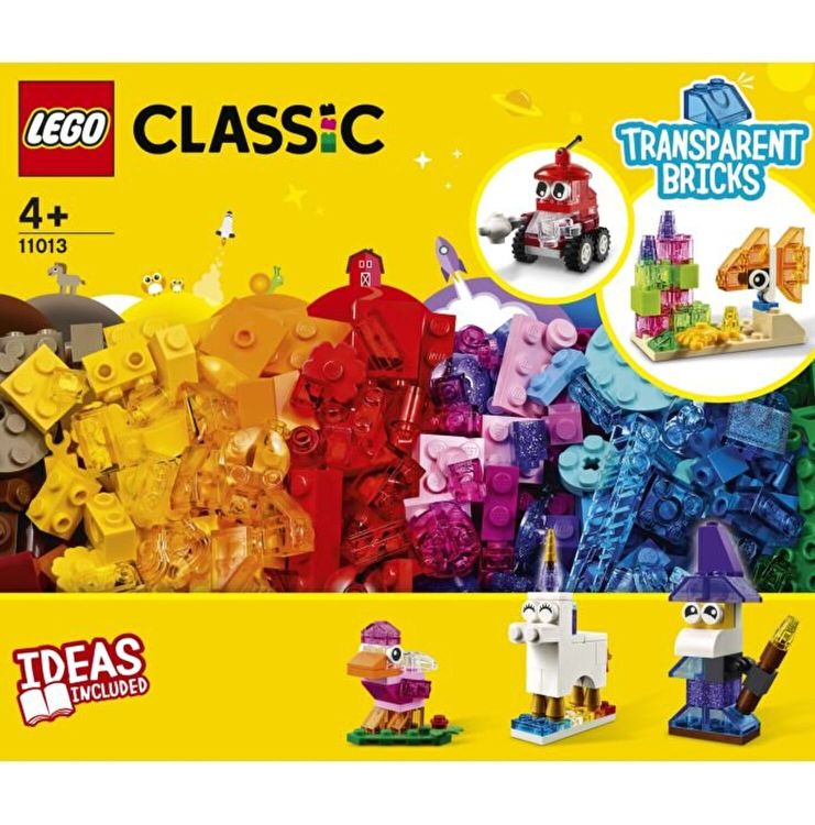 Setul de constructie Caramizi transparente creative LEGO Classic (11013) include o gama uluitoare de piese LEGO transparente in toate tipurile de culori, forme si dimensiuni, plus o selectie captivanta de caramizi, piese, ochi si roti clasice LEGO. Tot ce le trebuie copiilor pentru ore nesfarsite de joaca creativa.