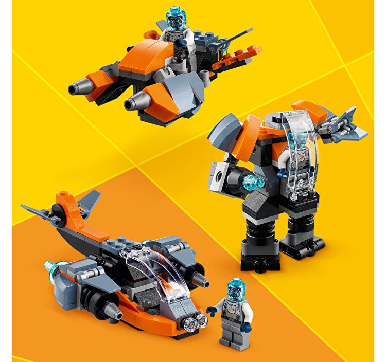 Micii exploratori ai spatiului se pot bucura de 3 experiente diferite de constructie si joaca cu acest set de jucarii LEGO Creator 3 in 1. Ei pot construi drona cibernetica, iar apoi o pot reconstrui intr-un robot cibernetic sau scuter cibernetic. Setul de jucarii vine cu o minifigurina robot noua din ianuarie 2021, cu cap albastru transparent, ce poate calatori in fiecare dintre cele 3 modele.