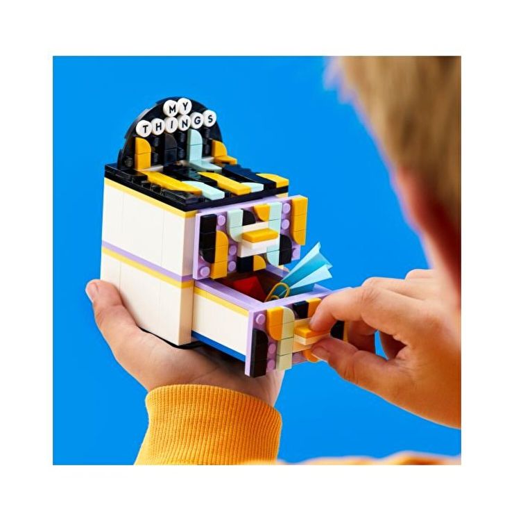 Acest set include o revista plina de inspiratie creativa, o multime de instructiuni disponibile online la LEGO. com/buildinginstructions pentru realizarea diferitelor obiecte de decor interior, plus ghiduri de asamblare pentru 5 obiecte DOTS personalizabile din revista - un organizator de birou, rafturi verticale pe doua niveluri, panou suspendat pentru mesaje, rama foto si o tava mica. Copiii pot folosi placutele colorate si pe cele cu litere pentru a crea modele si mesaje pentru piese, sau isi pot extinde creativitatea cu o punga DOTS Extra - seria 5 (41932) sau cu o cutie O multime de DOTS (41935) (vanduta separat).