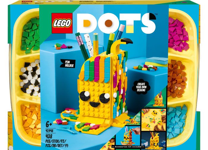 Distreaza-te pe cinste cu acest set LEGO DOTS Suport pentru pixuri! Asambleaza suportul pentru pixuri si apoi apuca-te de decorat. Alege banana vesela in culori vii si chip zambitor, transform-o intr-o banana veche si morocanoasa cu pete, sau ia o punga DOTS Extra Seria 6 (vanduta separat) si creeaza ceva nou. Apoi pune suportul pentru pixuri pe birou sau pe un raft, si foloseste-l!