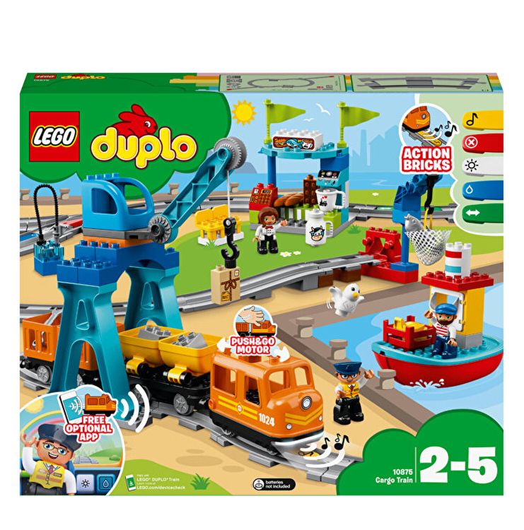 Marfarul LEGO DUPLO este acum si mai usor de controlat si interactionat in multiple moduri pentru copilasul tau. Copiii mici pot deveni mecanici de locomotiva cu motorul Impinge si porneste - o impingere usoara inainte sau inapoi pune trenul in miscare, iar o apucare ferma sau o ridicare de pe sine il opresc. Ajuta-i sa puna cele 5 caramizi colorate de actiune de-a lungul sinelor pentru a claxona, a aprinde sau a stinge luminile, a stationa si a realimenta, a schimba directia si a opri trenul dupa cum doresc. Cu portul, barca, cafeneaua, statia de incarcare, 2 macarale, 3 figurine DUPLO plus figurina animal si o multime de sine grozave incluse in acest set LEGO DUPLO, prescolarii se pot bucura de clasica si distractiva joaca cu trenuri. Descarca aplicatia optionala pentru a descatusa chiar mai multe posibilitati de joaca, incluzand functia de telecomanda si activitati amuzante pentru copilasul tau!
