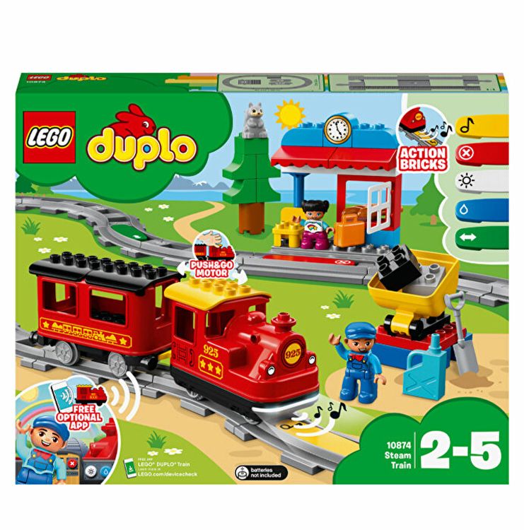 Trenul cu aburi LEGO DUPLO 10874 este acum si mai usor pentru copilul dumneavoastra de controlat si de a interactiona in mai multe moduri. Copiii mici pot deveni soferii trenului cu motorul Push & Go - o apasare usoara, inainte sau inapoi, trimite trenul in drum si o apasare ferma sau ridicarea de pe sine il va opri. Ajutati-i sa aseze cele 5 caramizi de actiune colorate de-a lungul pistei pentru a suna din claxon, sa aprinda si sa stinga luminile, sa faca pauza si sa realimenteze, sa schimbe directia si sa opreasca trenul oriunde doresc. Cu o gara, basculanta de carbune, 2 figurine DUPLO plus o cale de tren inclusa in acest set LEGO DUPLO, prescolarii se pot bucura de jocul clasic si distractiv. Descarcati aplicatia optionala pentru a debloca si mai multe posibilitati de joc, inclusiv functia de telecomanda si activitati distractive pentru a completa distractia cu copilul dumneavoastra!