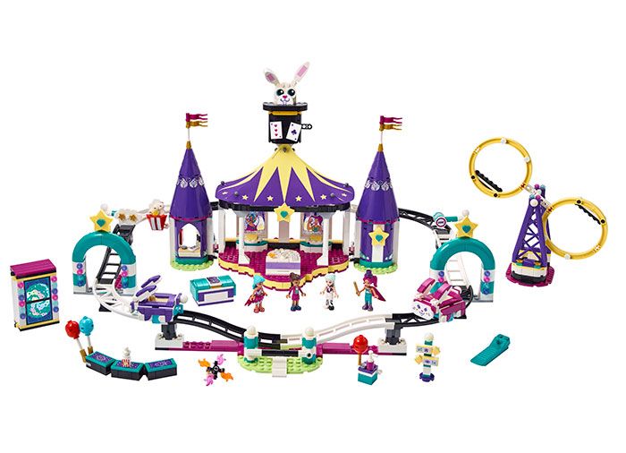 Modelul din 974 de piese este un proiect de constructie inspirator, iar odata construit, ofera o multime de moduri creative de joaca. In centru se afla cortul mare cu acoperis din panza, unde va avea loc spectacolul de magie. Copiii pot juca rolul magicianului, iar cu ajutorul cutiei cu functie inteligenta, pot face minipapusile LEGO Friends sa dispara! Sau isi pot imagina ca sunt jongleri inghititori de flacari. Setul include o jucarie montagne russe, impreuna cu masini iepuras simpatice si camera, si o pendula pentru a invarti copiii in curse. Cand lumina e stinsa, copiii pot privi cum prind viata caramizile care lucesc in intuneric!