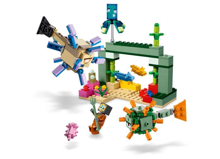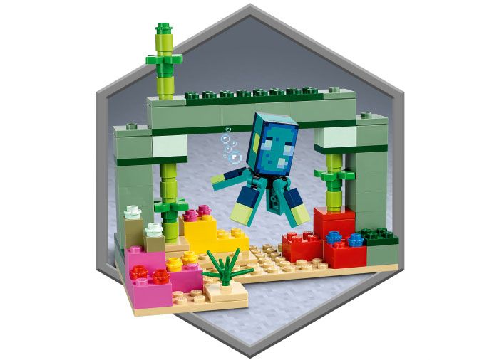 Copiii accepta o provocare plina de actiune in aceasta misiune captivanta Minecraft in adancul oceanului. La inceput, trebuie sa construiasca un monument intre coralii colorati ai recifului. Acolo pot gasi o comoara ascunsa si 2 mobi Minecraft emblematici: un pazitor si un pazitor senior care sunt hotarati sa-i opreasca. inarmati cu un trident si ajutati de 3 axoloti de nadejde, copiii trebuie sa respinga atacurile mobilor ostili pentru a-si continua misiunea. Un alt pericol vine de la un tragator cu arc care lanseaza o racheta laser cu o miscare a cozii pazitorului mai mare. Cu nenumarate posibilitati creative de joc, aceasta aventura cu caramizi LEGO pune in mainile copiilor toata emotia jocului Minecraft.