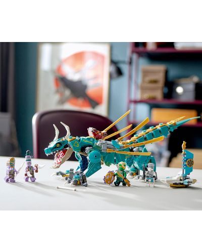 Dragonul de jucarie vine cu4 minifigurine: Lloyd insula, Zane insula, PoulEriksiStrajerul tunetului, toate dotate cu arme, astfel incat copiii pot juca confruntari palpitante pentru a pune stapanire pe amuleta furtunii. Mai este si o placa de surf cu functie de tragere pentru a adauga si mai multa distractie in batalii.