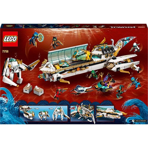 Acest set de joc subacvatic are 10 minifigurine impresionante: Kai Scuba, Nya Scuba, Zane Scuba, Jay Scuba, Cole Scuba si Lloyd Scuba, toti cu labe de scafandru, echipament de scafandru si arme pentru a se lupta impotriva maleficului cvartet format din Printul Kalmaar, un Pazitor Maaray si 2 Boti Wu.