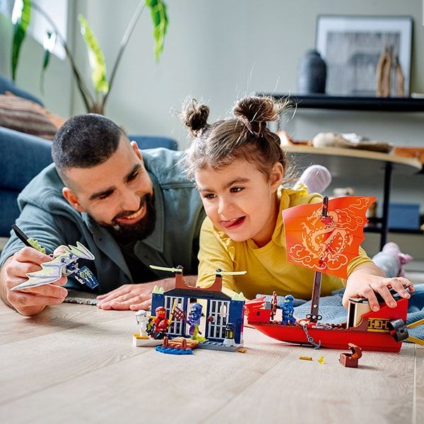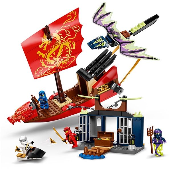 Seturile LEGO 4+ sunt modul perfect in care adultii se pot bucura de constructie alaturi de copii. Instructiunile simple ilustrate incluse sunt perfecte pentru a indruma copiii in procesul de constructie. Seturile vin de asemenea cu Instructions PLUS in aplicatia Instructiuni de constructie LEGO. Acest ghid interactiv include instrumente cu zoom, mod fantoma si rotire pentru a ajuta copiii sa profite la maxim de experienta. Porneste in calatorie cu Kai, Zane si Jay pe nava lor ninja, pentru o batalie epica pe mare impotriva Fantomei Ninja Karenn. Porneste la atac sarind pe super-rapidul skijet sau stand pe spinarea unui dragon care se napusteste din cer. Captureaza-l pe acest raufacator periculos si acosteaza pe mica insula pentru a-l arunca in inchisoare!