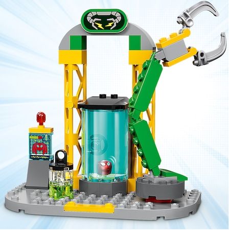Include 3 minifigurine, masina Omului paianjen, scena laboratorului si un mecanism de lupta;