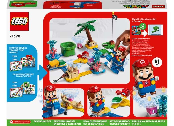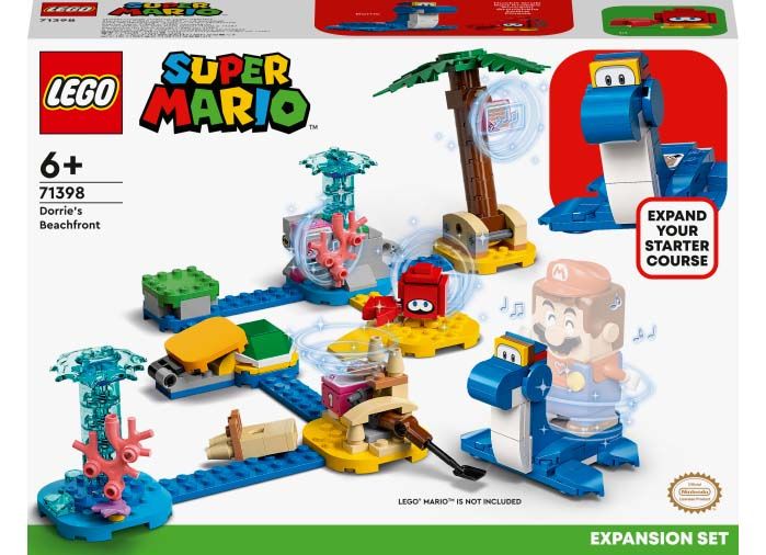 Adauga un nivel plin de culoare pe plaja la universul LEGO Super Mario, cu Setul de extindere Plaja lui Dorrie (71398) pentru copii de 6 ani si mai mari. Include o figurina LEGO Dorrie, pe care LEGO Mario sau LEGO Luigi (figurinele nu sunt incluse) pot calatori. Exista un lansator pentru a azvarli cochilia verde in directia figurinei Crabul Huckit, plus un castel de nisip, o fantana si un copac construibile, fiecare cu functii cool pe care jucatorul trebuie sa le activeze pentru a accesa Blocurile 1, 2, 3. (Nota: Setul de baza 71360 sau 71387 este necesar pentru jocul interactiv.)