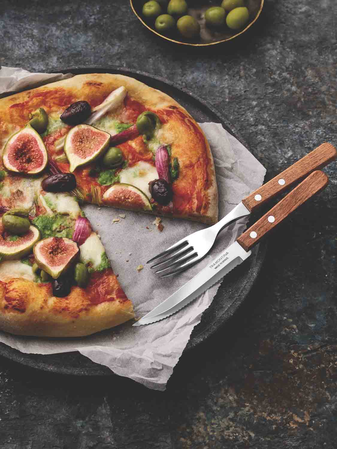 Cu manere din lemn natural atasate cu nituri din aluminiu, vesela Dynamic adauga o nota rustica meselor dumneavoastra.