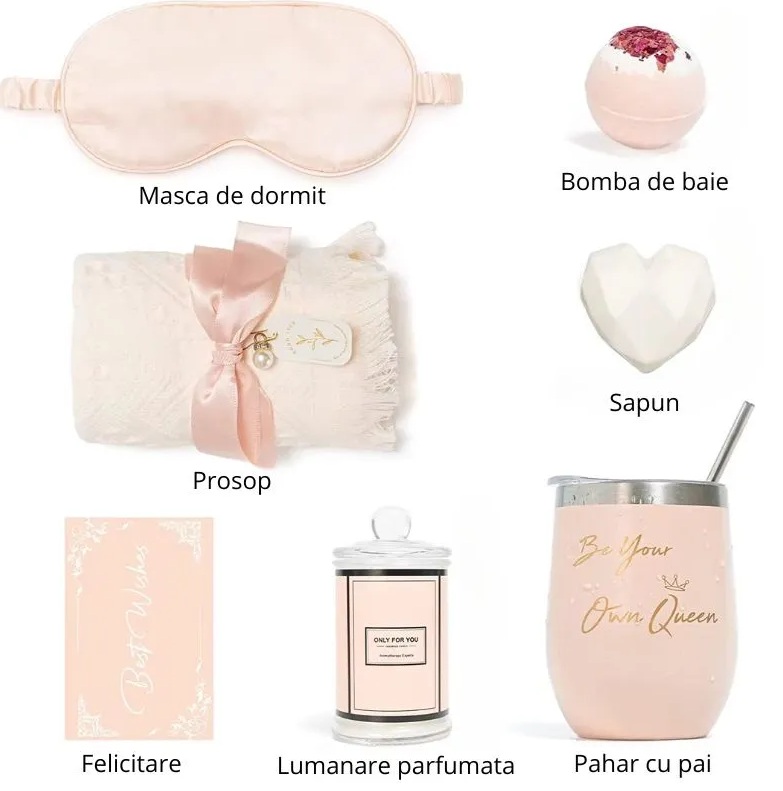 Fiecare produs din set este atent selectat pentru a aduce un plus de confort si relaxare, de la produsele de baie parfumate pana la accesoriile practice si elegante.