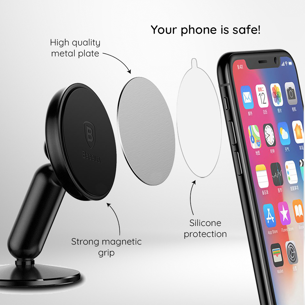 Pachetul contine: suport auto pentru telefon magnetic, 2 placute circulare, 2 protectii transparente pentru telefon, sticker de rezerva cu adeziv 3M.
