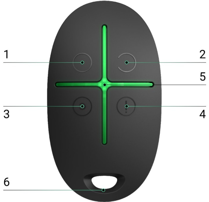 Ajax SpaceControl este o telecomanda cu protecție împotriva clicurilor accidentale. Permite setarea sistemului Ajax în modul armat, noapte sau dezarmat și pornirea unei alarme.